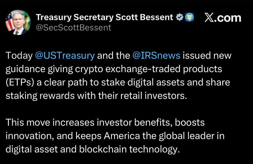 The US Treasury and IRS issued guidance enabling crypto ETPs to stake digital assets and share rewards with retail investors