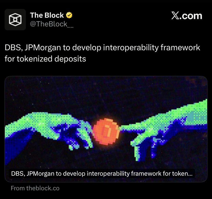 DBS and JP Morgan’s Kinexys are developing an interoperability framework to enable tokenized deposit transfers between JPM Deposit Tokens (on Base) and DBS Token Services (permissioned blockchain), bridging public and private networks for cross-platform client transactions