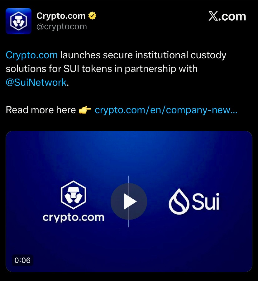 Crypto(.)com partnered with Sui to launch regulated institutional custody and liquidity support for SUI tokens