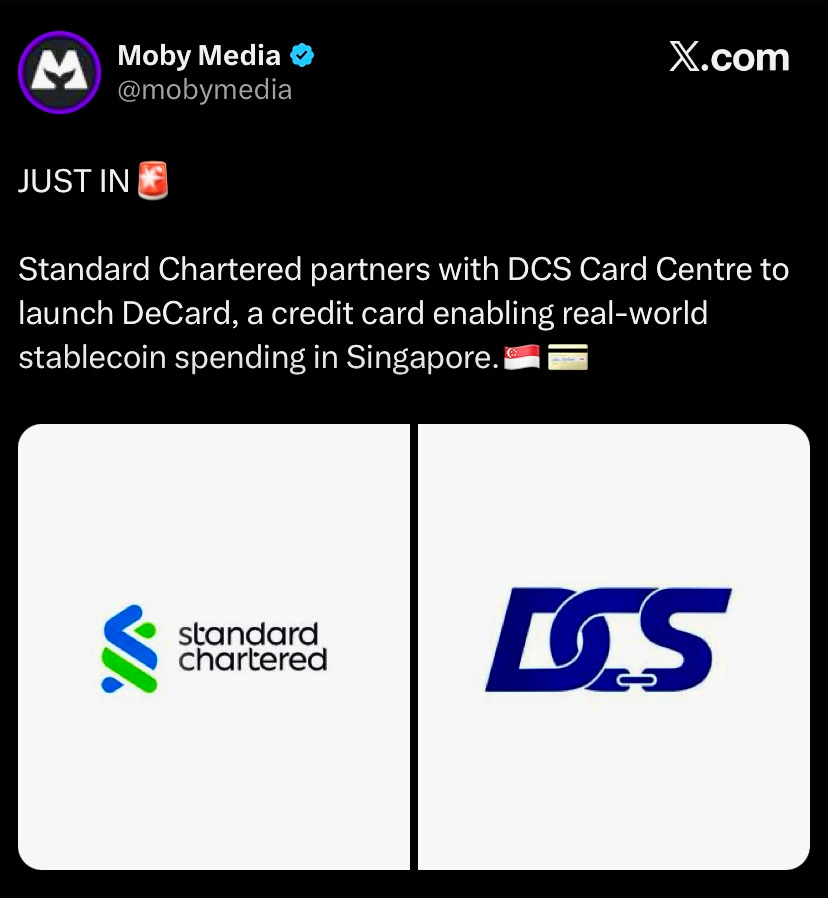 Standard Chartered partners with DCS Card Centre to support DeCard, a stablecoin-to-fiat credit card in Singapore, providing transaction banking services including cardholder processing, account management, and fiat/stablecoin settlements, with plans to expand into additional markets