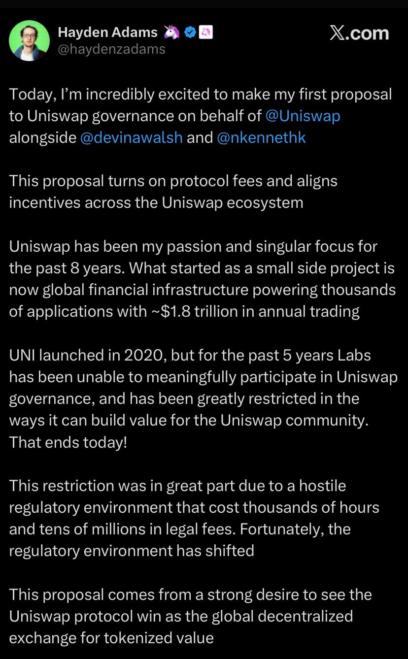 Uniswap proposed activating protocol fees to burn UNI, consolidating teams under Uniswap Labs with 20M UNI annual budget and zero interface fees, critics argue it weakens LP competitiveness compared to Curve, Aerodrome ve token models