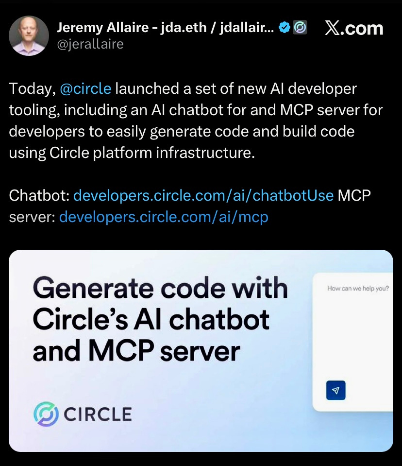Circle unveiled AI Tools including an AI chatbot and MCP server to accelerate developer coding/building on Coinbase infra
