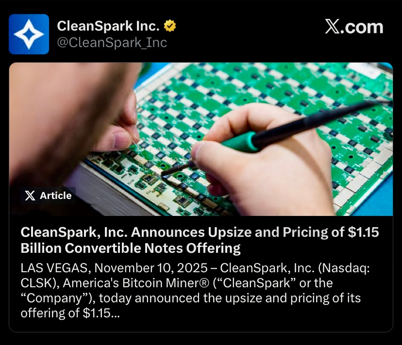 Bitcoin mining firm CleanSpark plans to raise $1 billion via zero-coupon convertible senior notes due 2032, allocating up to $400 million for share buybacks with the remainder funding data center expansion, debt repayment, and corporate purposes