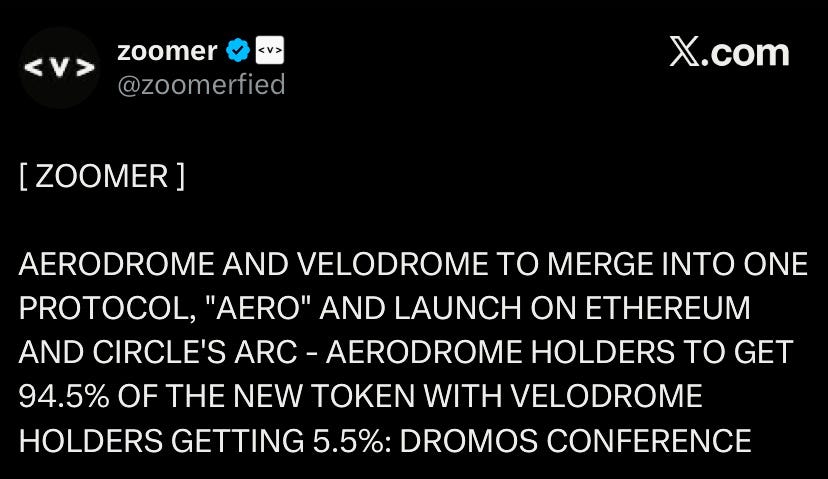 Aerodrome and Velodrome merge into one protocol, Aero. It’ll go live on Ethereum and Circle’s ARC, with token distribution of 94.5% to Aerodrome holders and 5.5% to Velodrome holders