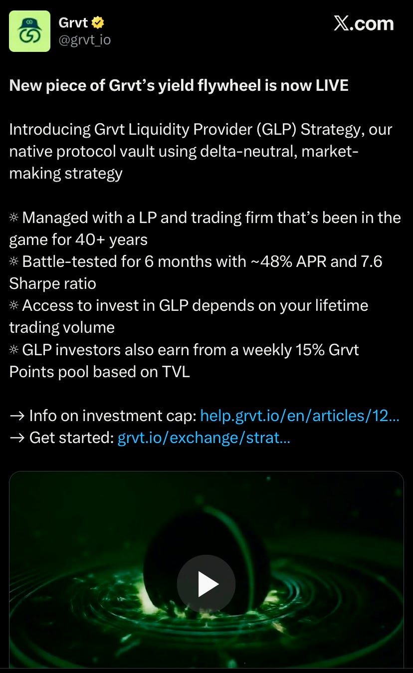 Grvt launched its GLP Strategy vault using delta-neutral market making to generate yield, offering fully transparent on chain returns with a 7.6 Sharpe ratio and 100% profits to liquidity providers.