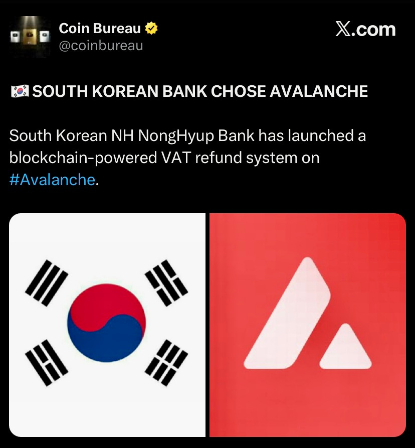 South Korean bank NH NongHyup launched a PoC with Avalanche, Fireblocks, Mastercard, and Worldpay to test stablecoin-based VAT refunds for tourists.