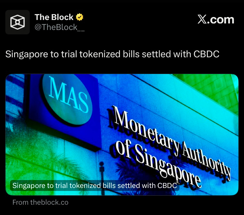 Singapore’s central bank will trial issuing tokenized MAS bills to primary dealers settled with CBDC, with details coming in 2026