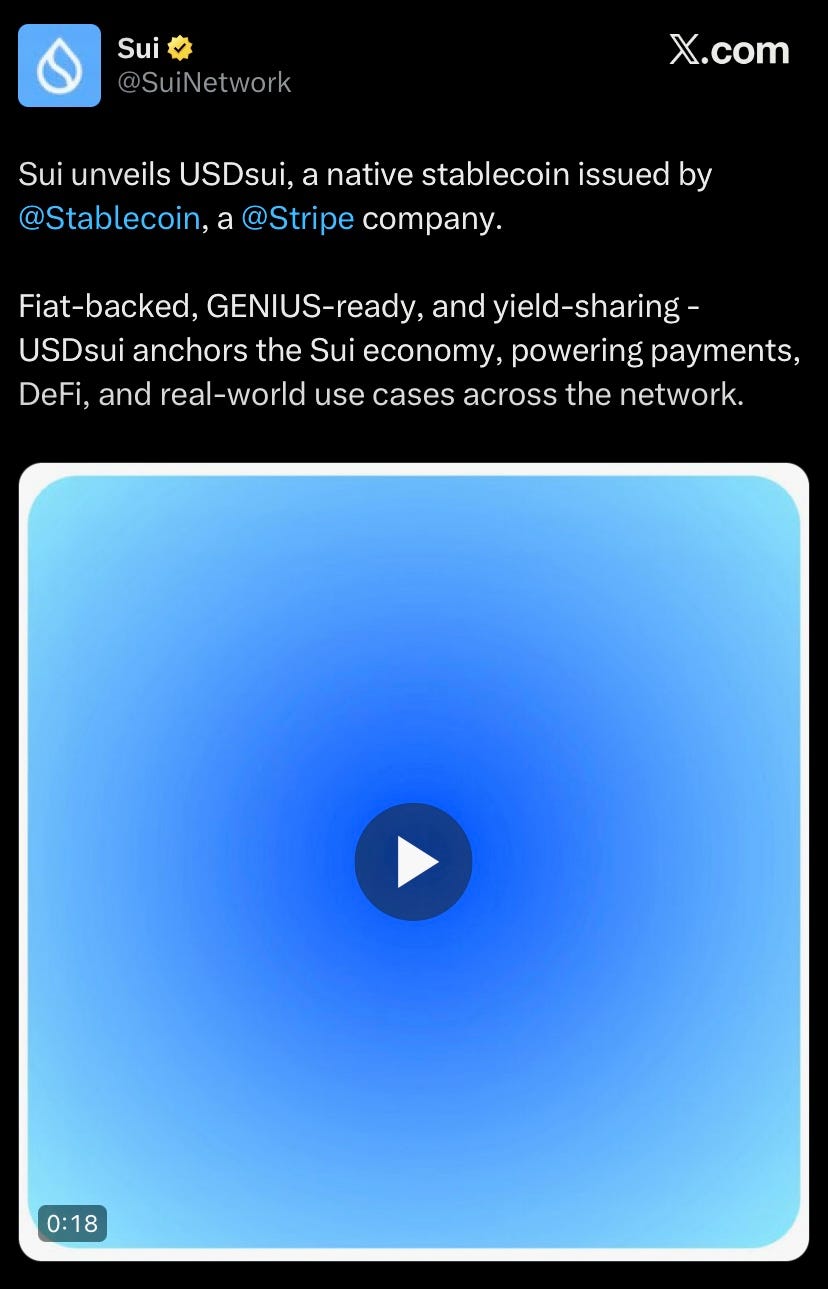 Sui will launch its native stablecoin USDsui via Bridge’s Open Issuance, designed as a foundational stablecoin for the Sui network.