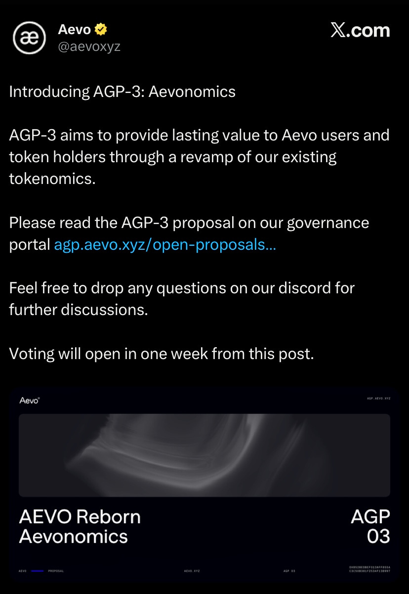 Aevo unveiled AGP-3, upgrading AEVO token from governance token to include value accrual, compounding mechanics, new incentives, supply buybacks and burns, plus a major initial burn