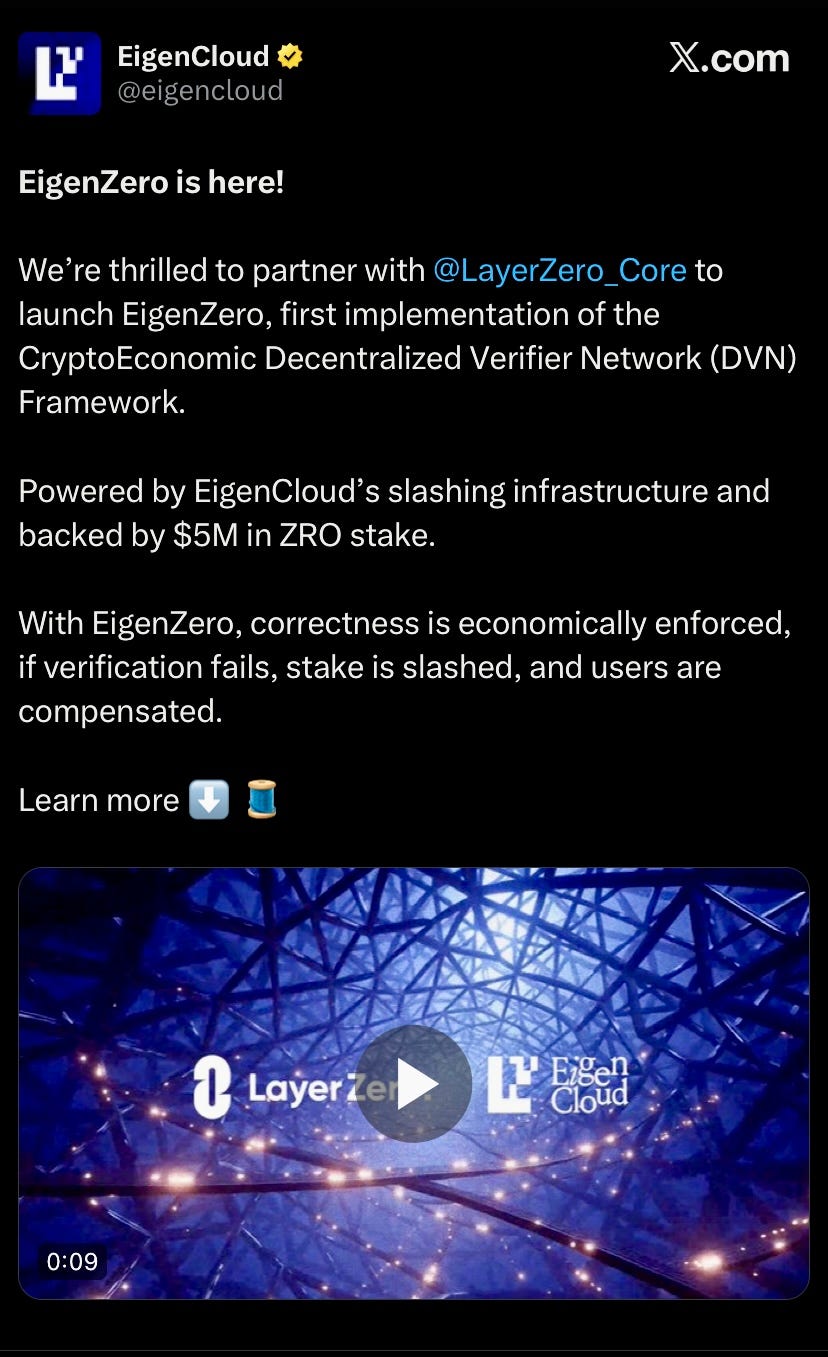LayerZero and EigenCloud launched EigenZero, the first CryptoEconomic DVN using EigenCloud’s slashing infrastructure with $5M in ZRO stake