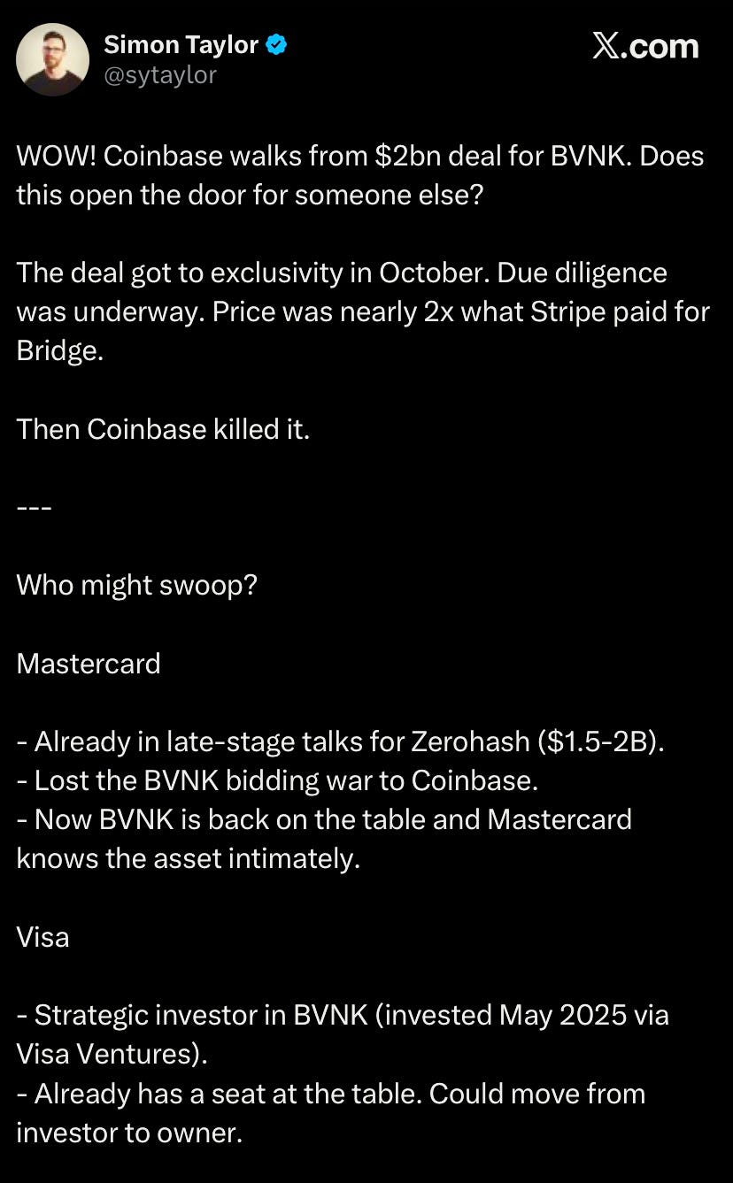 Coinbase abandoned plans to acquire UK stablecoin infrastructure firm BVNK for $2 billion.