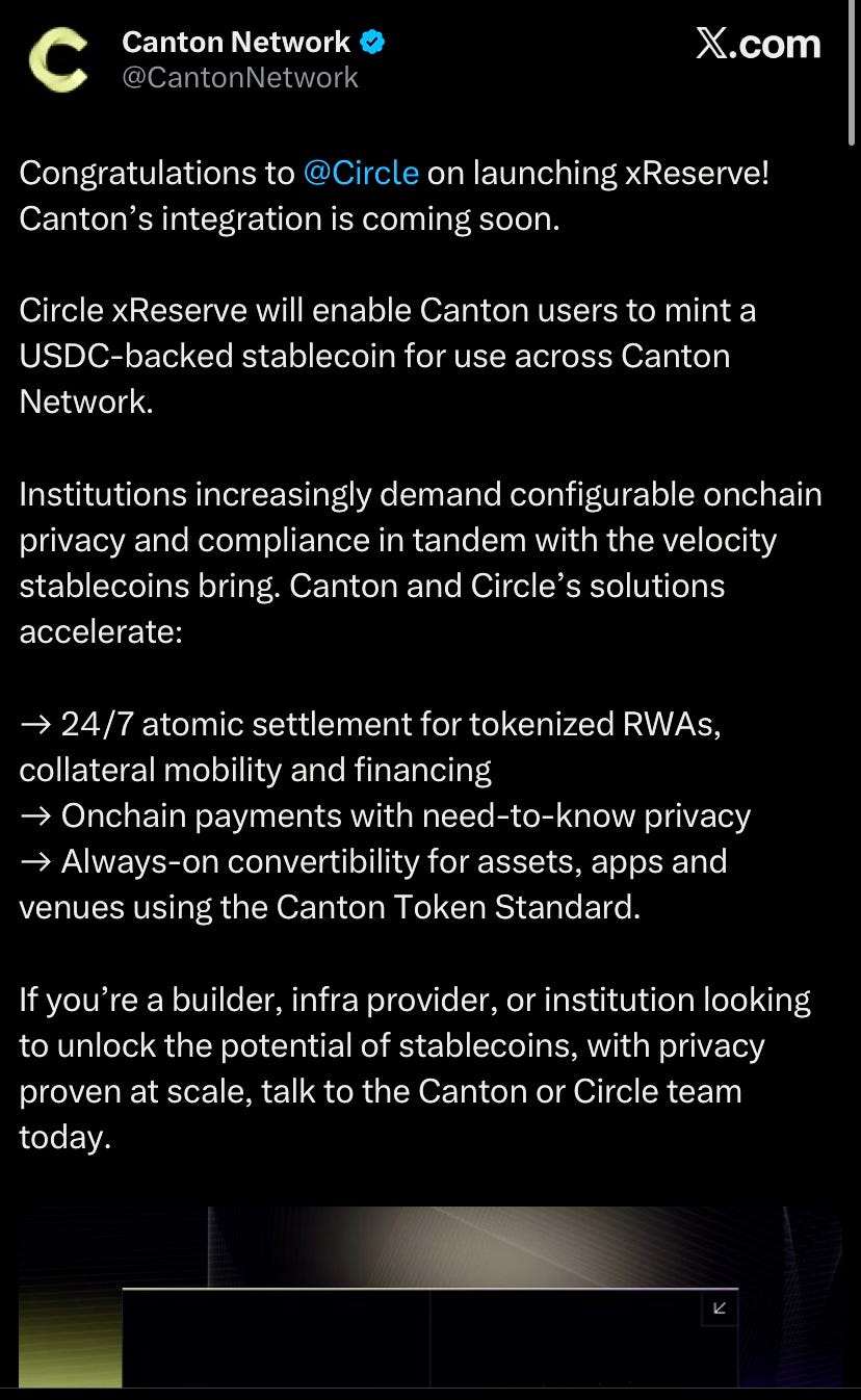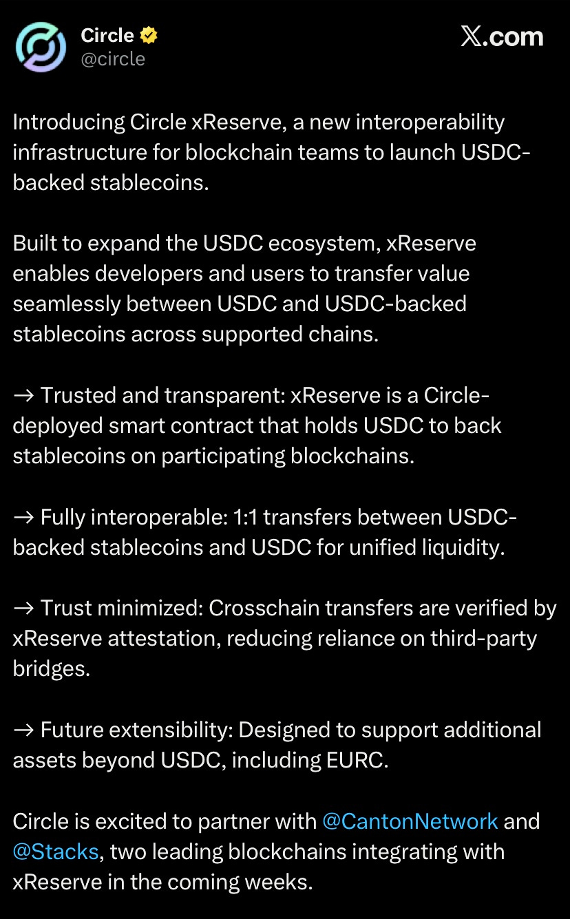 Circle launched Reserve, allowing developers to create custom stablecoins backed 1:1 by USDC, with early adopters including Stacks’ USDCx for Bitcoin DeFi and Canton Network for privacy-focused institutional RWA applications