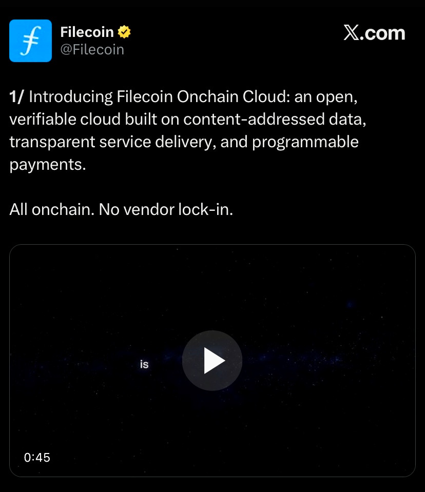 Filecoin Foundation launched Filecoin Onchain Cloud yesterday in Buenos Aires during a major Cloudflare outage, offering blockchain-integrated decentralized storage with over 25 exabytes capacity, early integrations including ENS and Monad, and mainnet deployment planned for 2026.