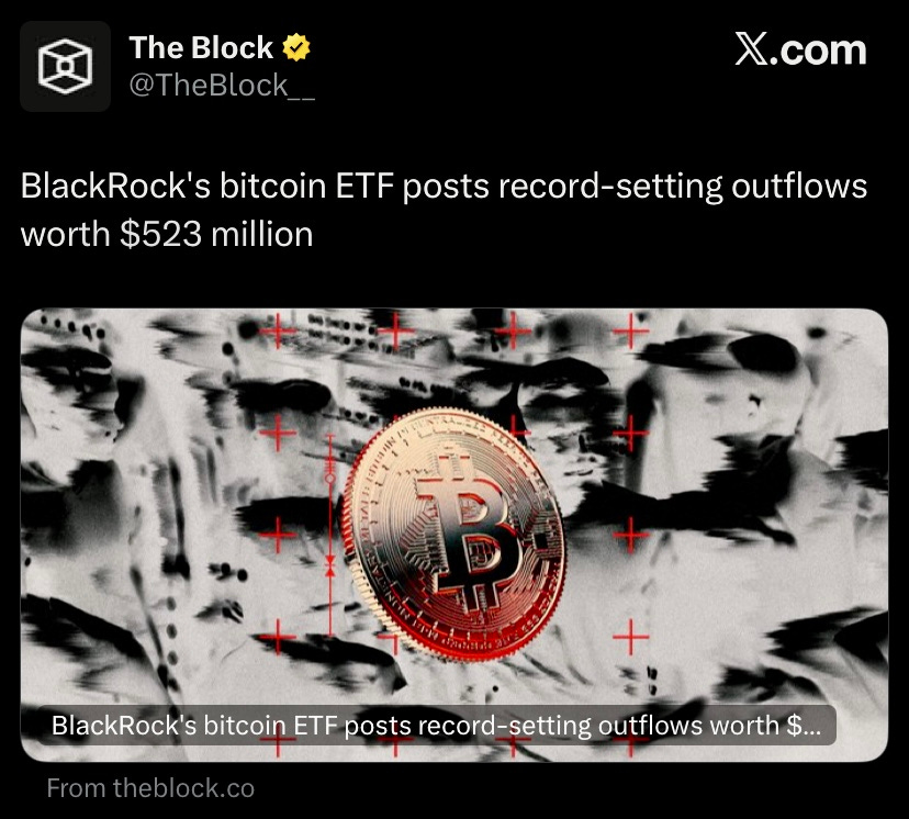 BlackRock’s IBIT bitcoin ETF saw its largest ever single day outflow of $523 million on Tuesday, while spot Solana ETFs extended their winning streak to 16 consecutive days with $420 million in total inflows.