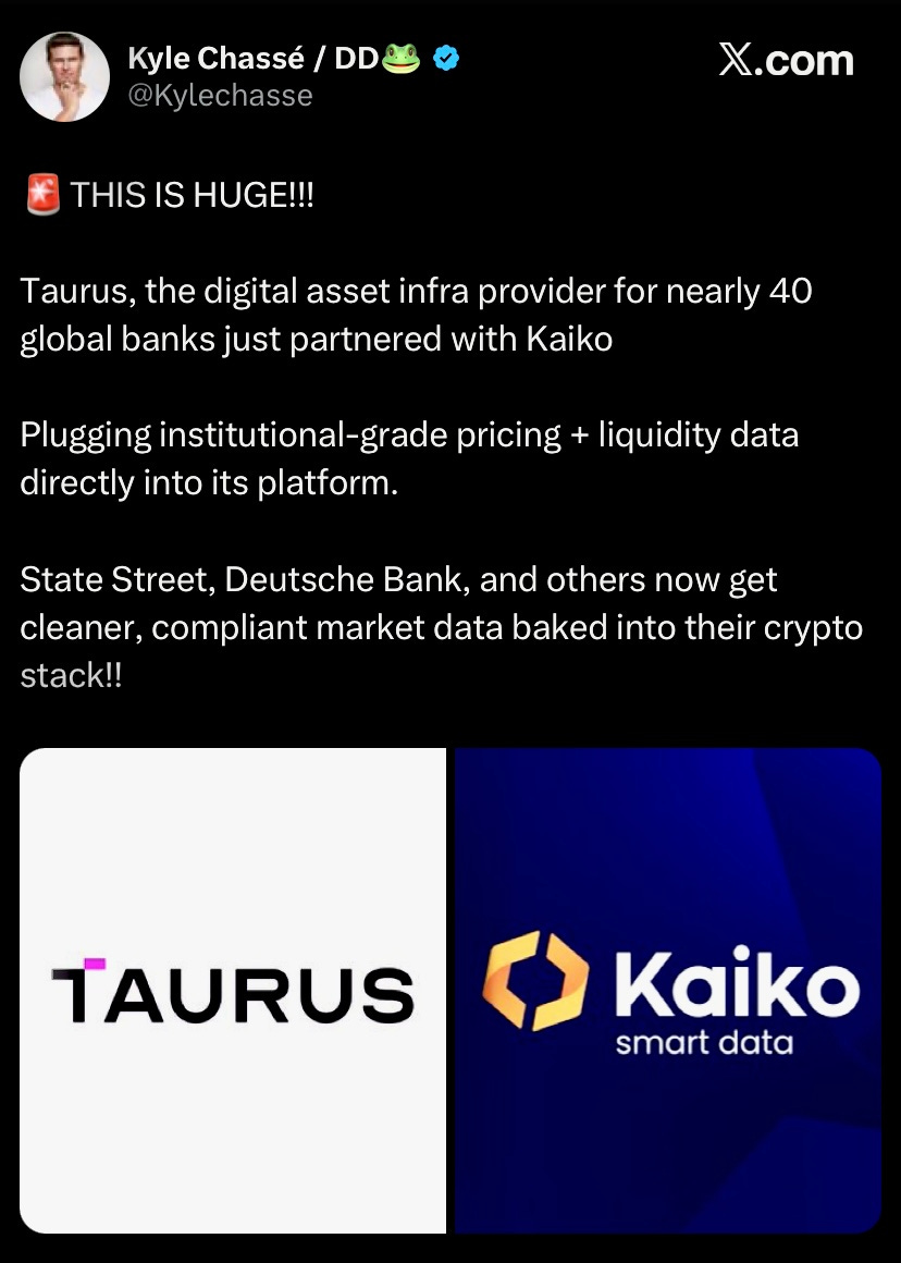 Taurus, the digital asset infrastructure provider serving nearly 40 global banks including State Street and Deutsche Bank, has integrated Kaito’s institutional-grade pricing and liquidity data from over 100 centralized and decentralized venues directly into its platform.