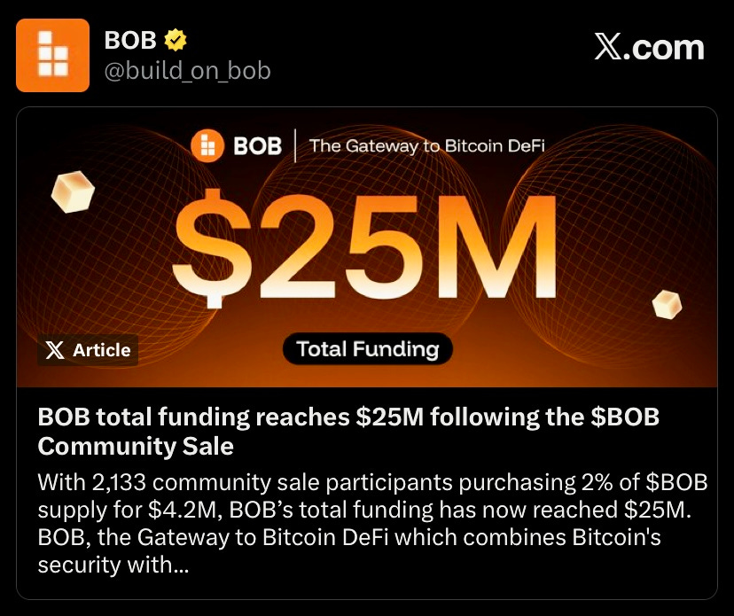 Build on Bitcoin, BOB completed its community sale raising $4.2M from 2,133 participants buying 2% of token supply, bringing total funding to $25M ahead of its token generation event with FDVs of $165M-$230M and 50% day-1 unlock.