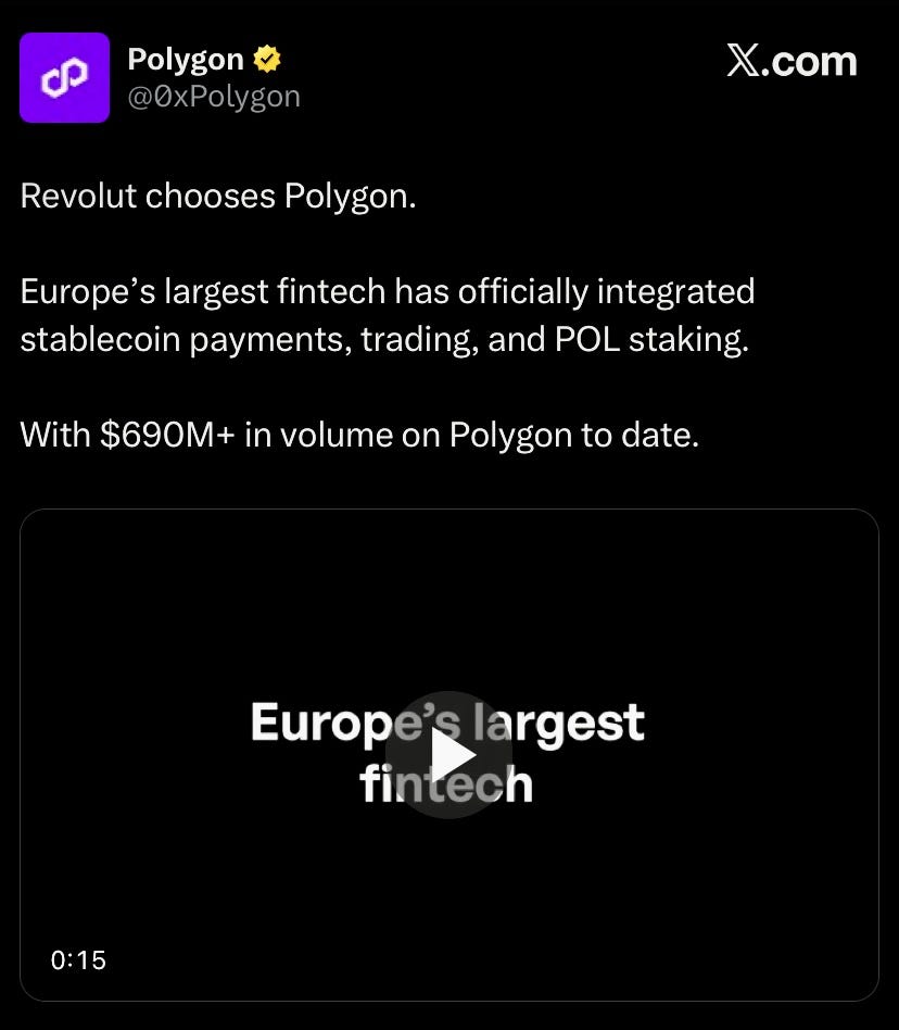 Revolut selected Polygon for stablecoin transfers and payments, integrating USDC/USDT remittances, in-app crypto card payments, and POL staking directly into its app with fee-free transfers and covered gas costs.