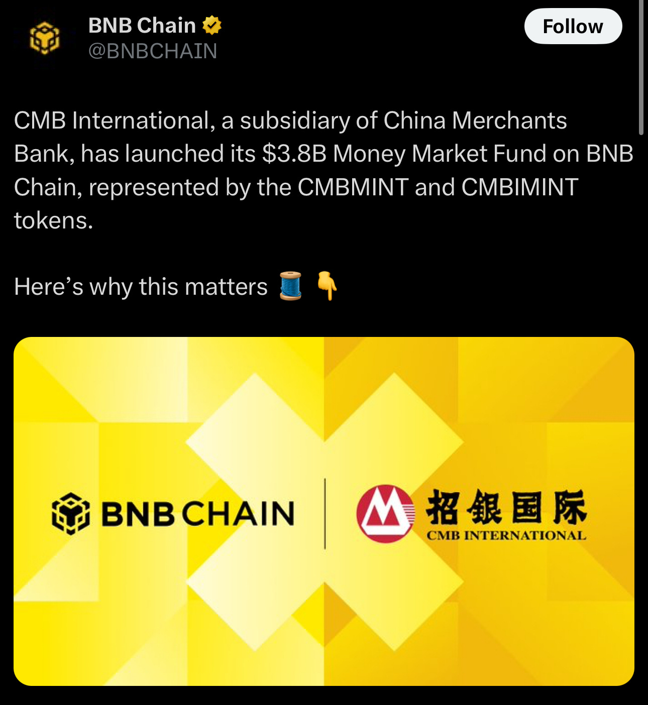 Chinese Merchant Bank, CMB International launched its $3.8B Money Market fund on BNB represented by CMBIMINT tokens