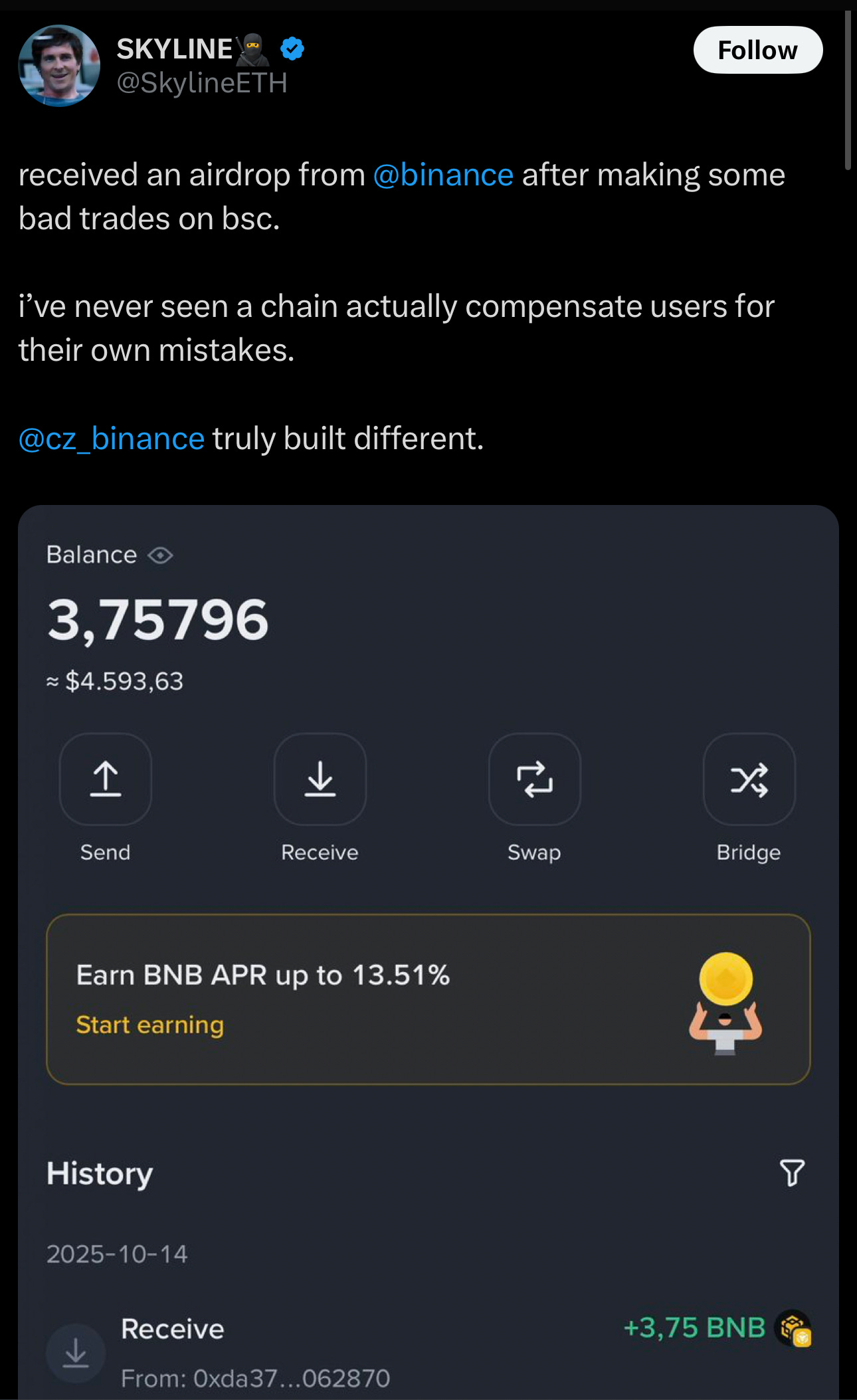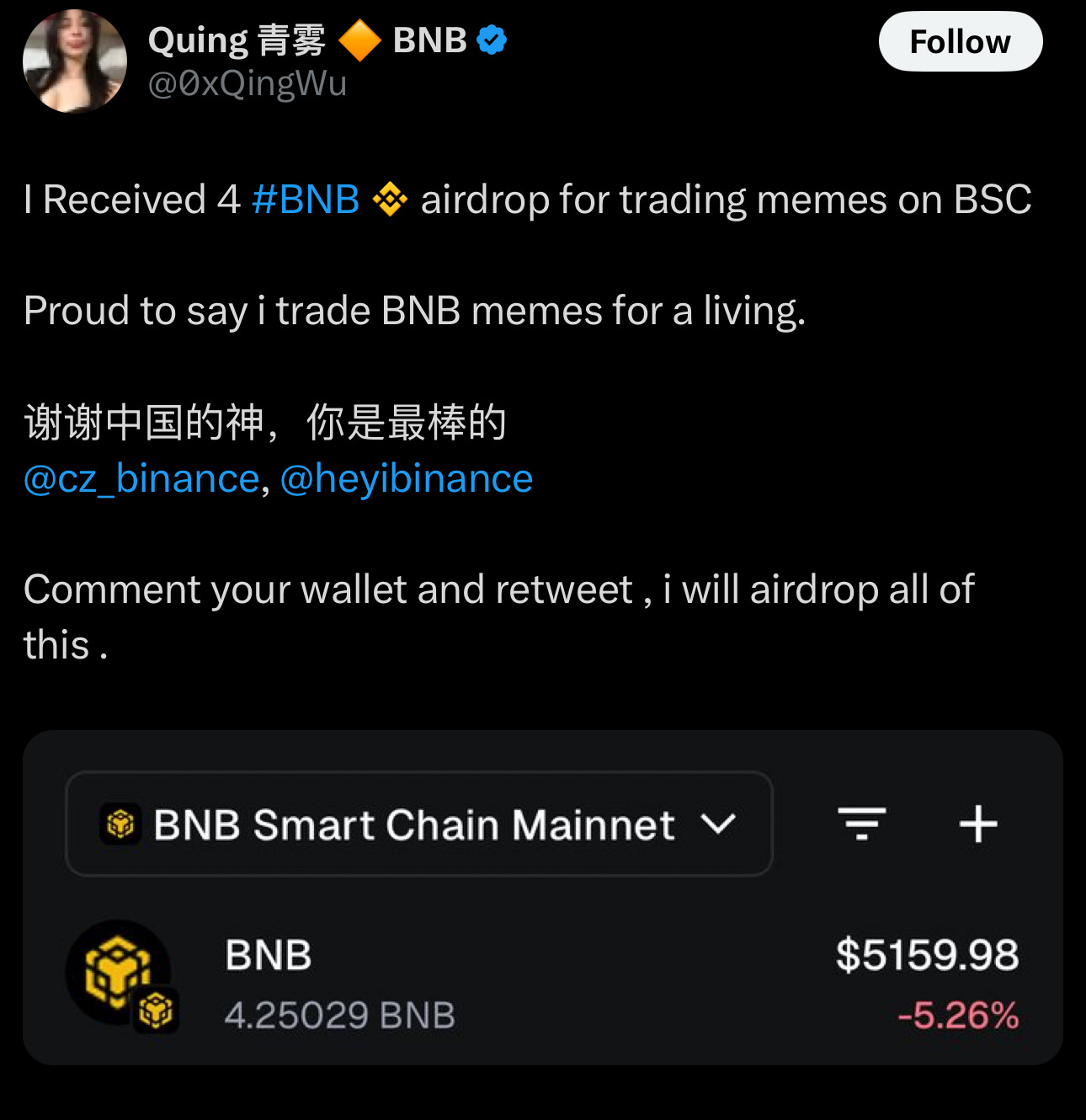 BNB airdrop to active BSC meme traders went live with most getting 3 BNB