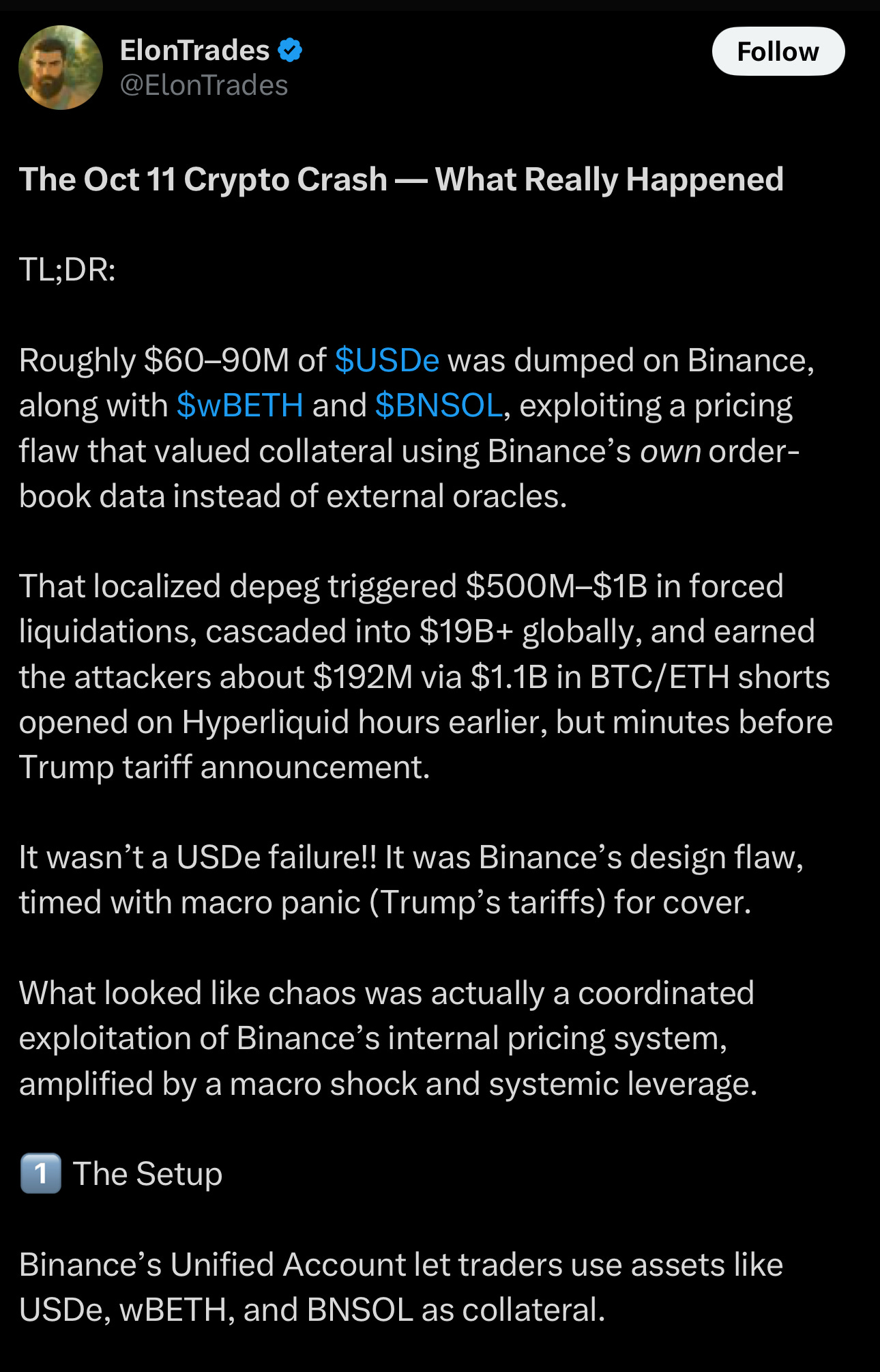 Binance is the scapegoat for the Oct 11 crypto crash because of their mispriced internal price oracles that caused liquidations