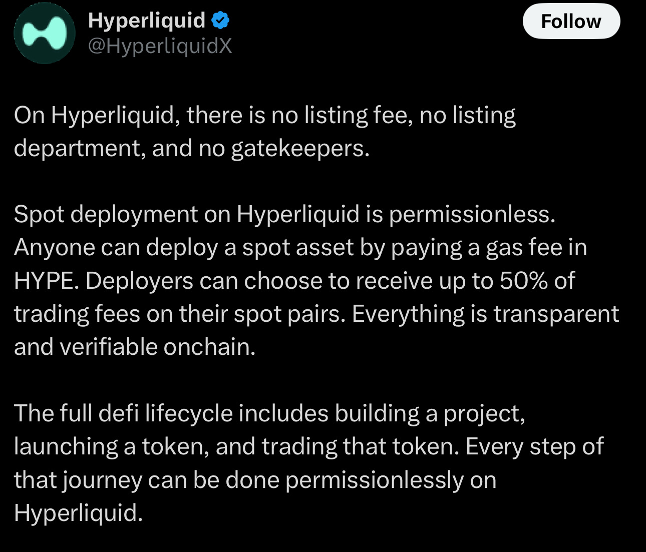 Hyperliquid listings is permissionless where builders have to bid $25k on an average for spot deployment or deposit 500k Hype ($20M) for Hip 3 perps
