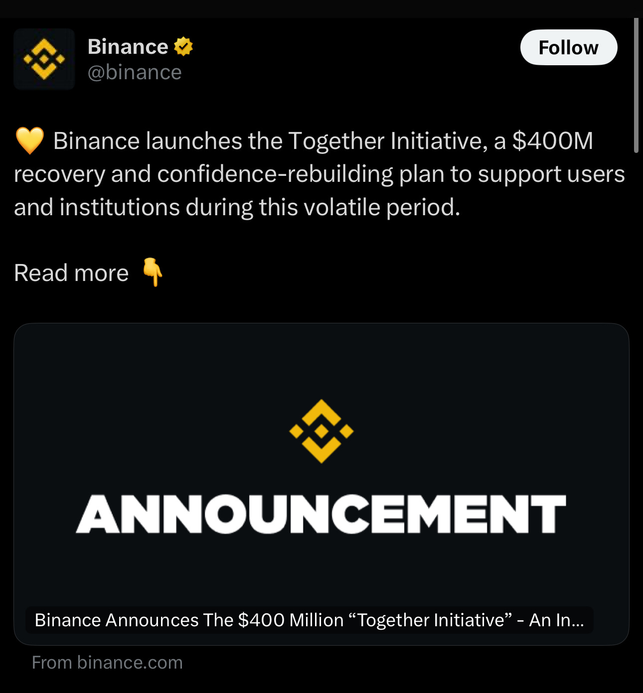In light of this, Binance launched a Together Initiative $400M recovery plan to compensate liquidated users