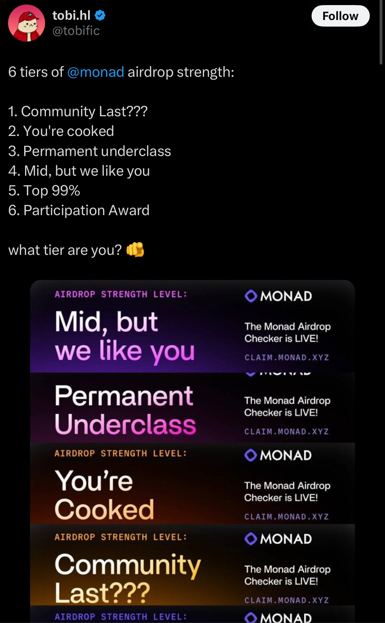 Monad airdrop eligibility claim went live with tiers from You’re cooked to community last