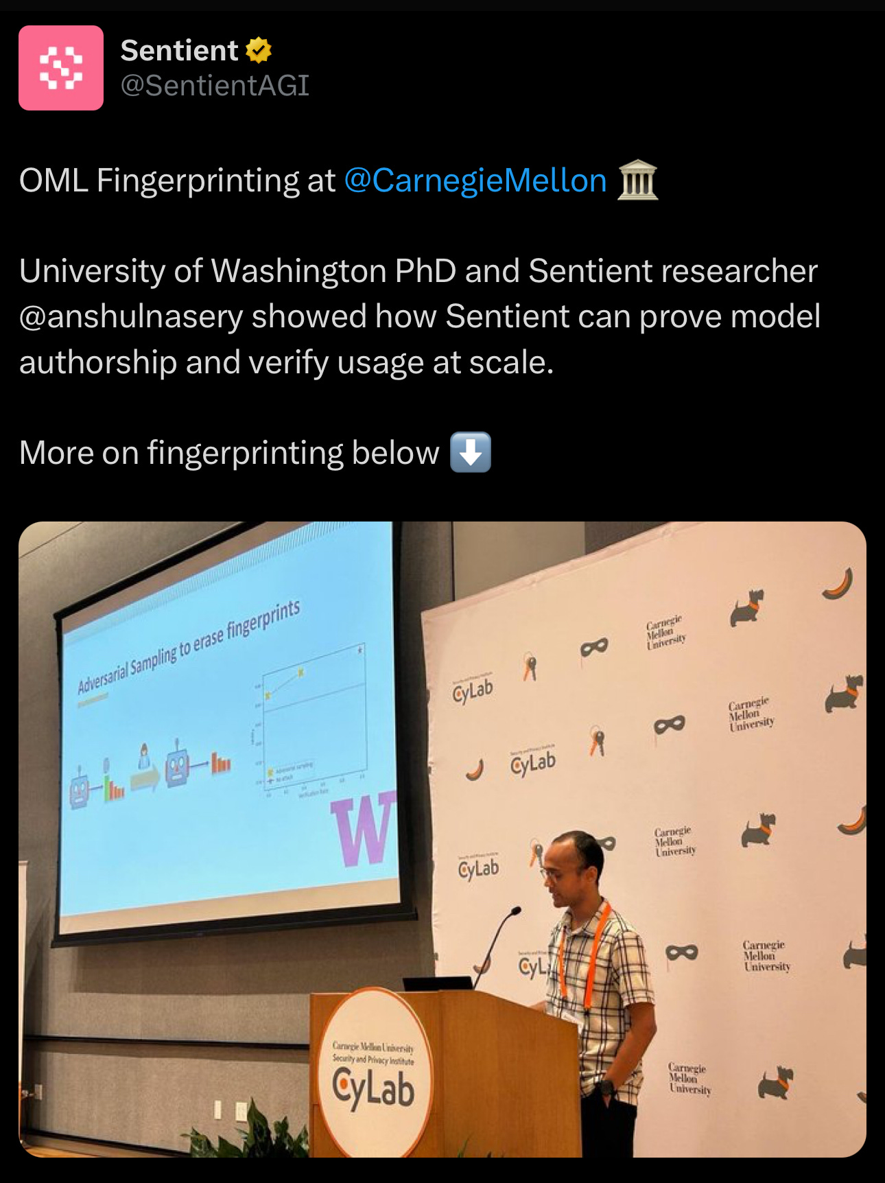 Sentient AGI published a blog on OML Fingerprinting at Carnegie Mellon University, Anshulnasery, University of Washington PhD and Sentient researcher, demonstrated how Sentient can prove model authorship and verify usage at scale