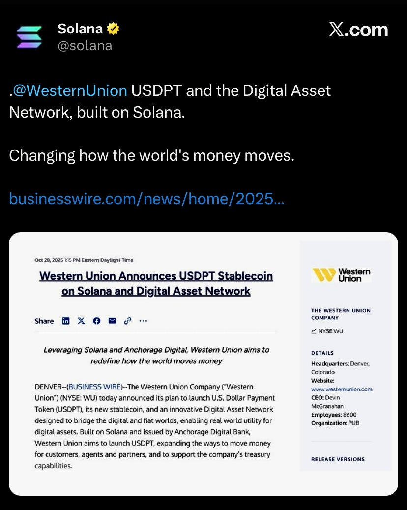 Western Union to launch stablecoin on Solana