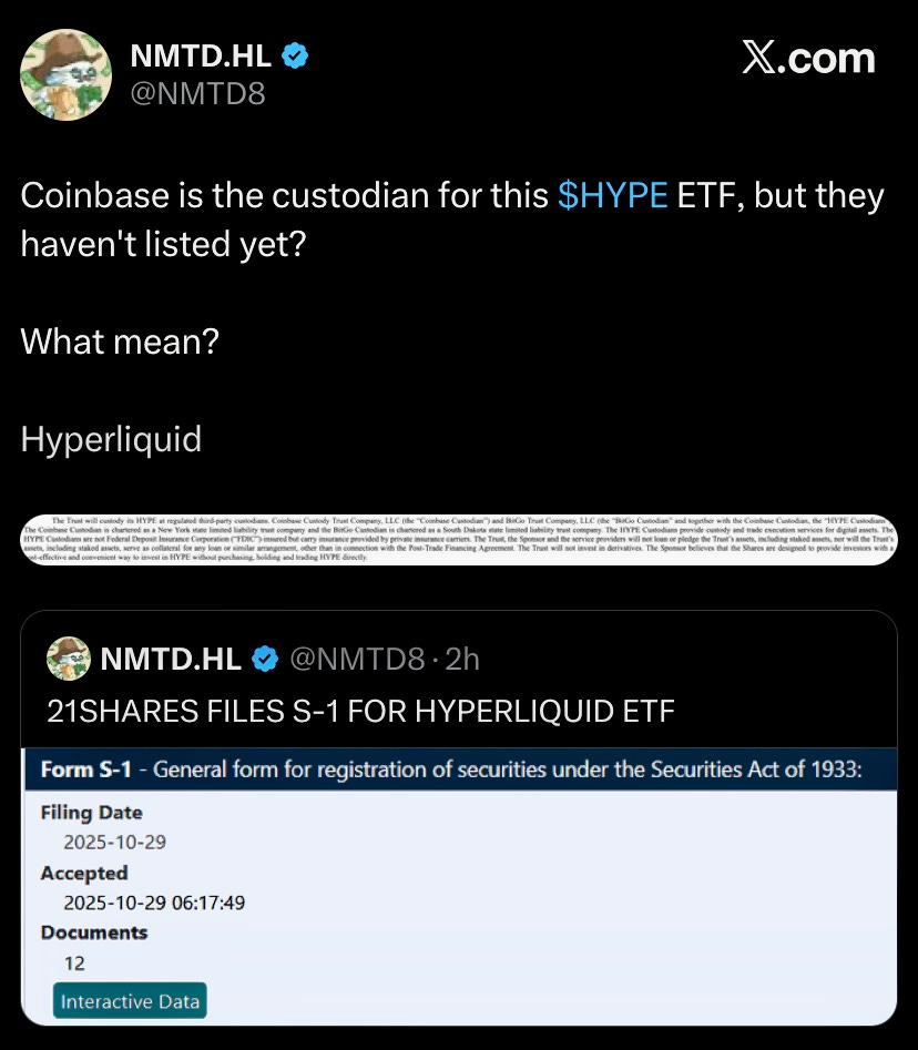 21Shares filed S-1 for Hyperliquid ETF. Coinbase is the custodian, means listing soon? 👀
