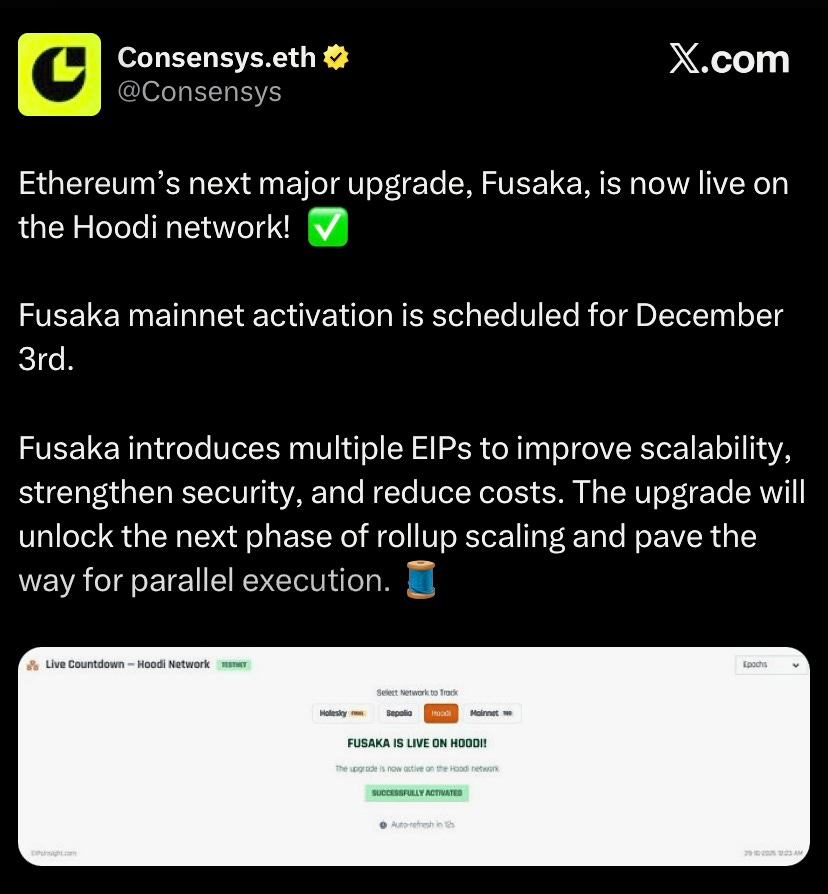 Ethereum next upgrade Fusaka is live on Hoodi testnet, with mainnet scheduled for December