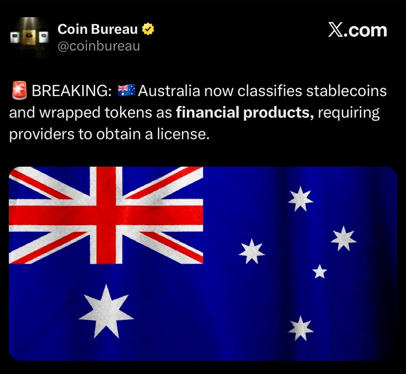 Australia now classifies stablecoins and wrapped tokens as financial products under updated guidance, says Bitcoin and some NFTs aren’t financial products