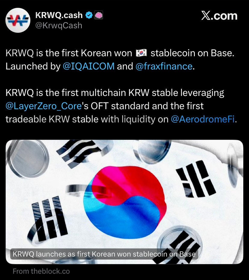 KRWQ, the first Korean won stablecoin launched on Base by IQ AI and Frax