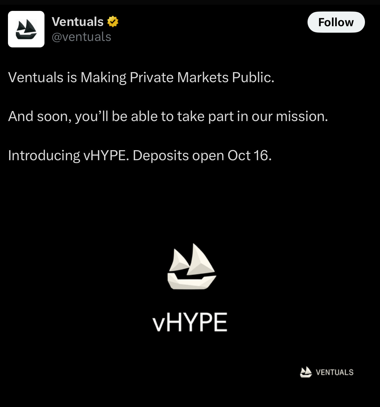 IPO market place Ventuals to launch vHYPE and allow HYPE deposits on Oct 16