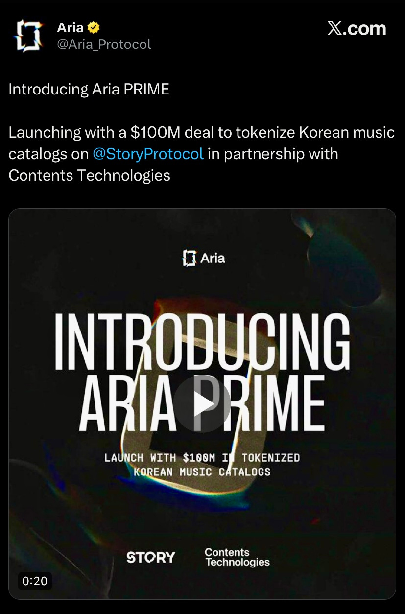 Aria Prime launched a $100M deal to tokenize Korean music catalogues on Story Protocol