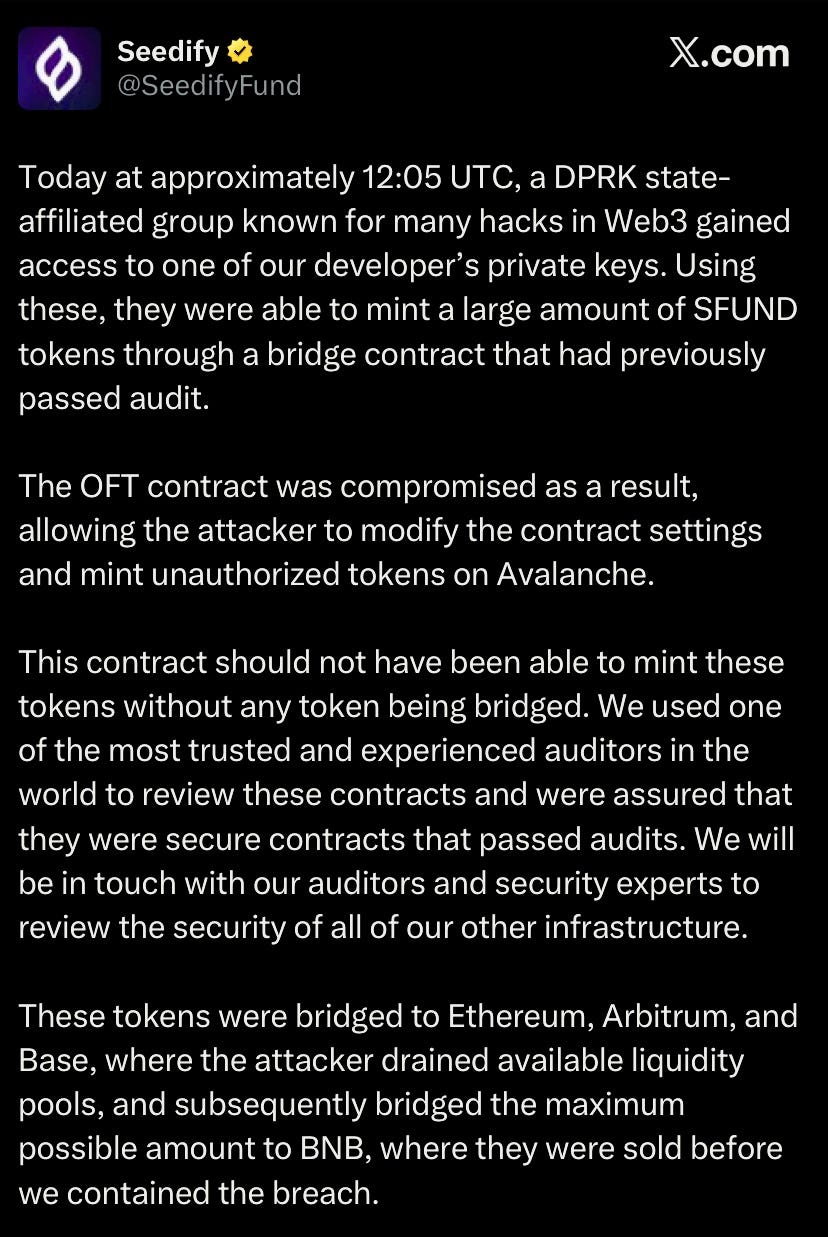 North Korea hackers gained access to Seedify dev wallet to hack their bridge/oft contract to mint and sell off huge amount of SFUND