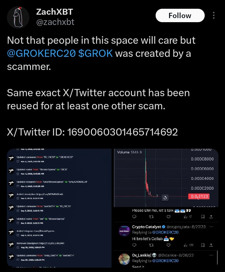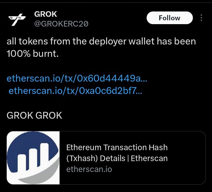 #Grok mania. ZachXBT said dev has ruggy past; then dev burns all dev tokens worth 180M Grok