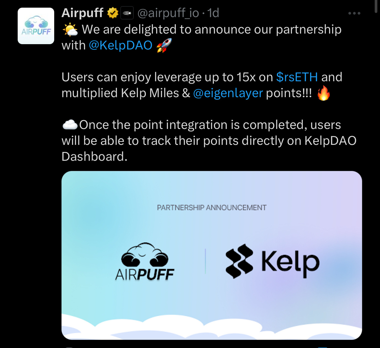 Airpuff X KelpDAO partnership— you can now leverage 15x $rsETH for leveraged yield and leveraged points