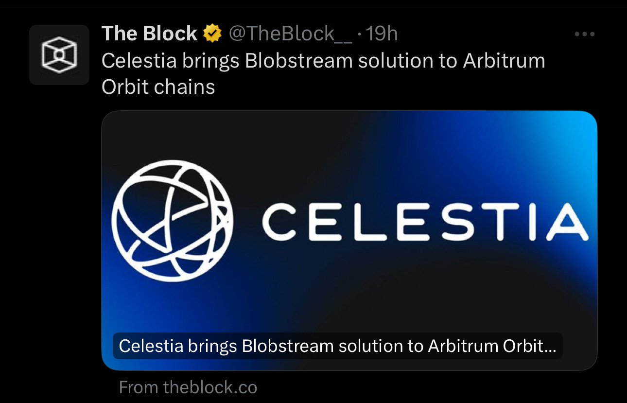 Celestia introduces Blobstream DA solution to Arbitrum. Devs can now create appchains using Celestia as DA