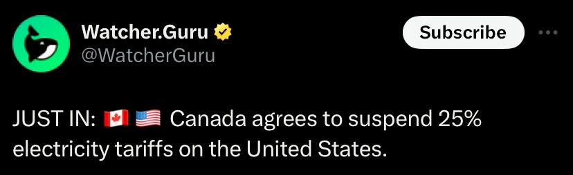 Canada to suspend 25% electricity tariff on USA