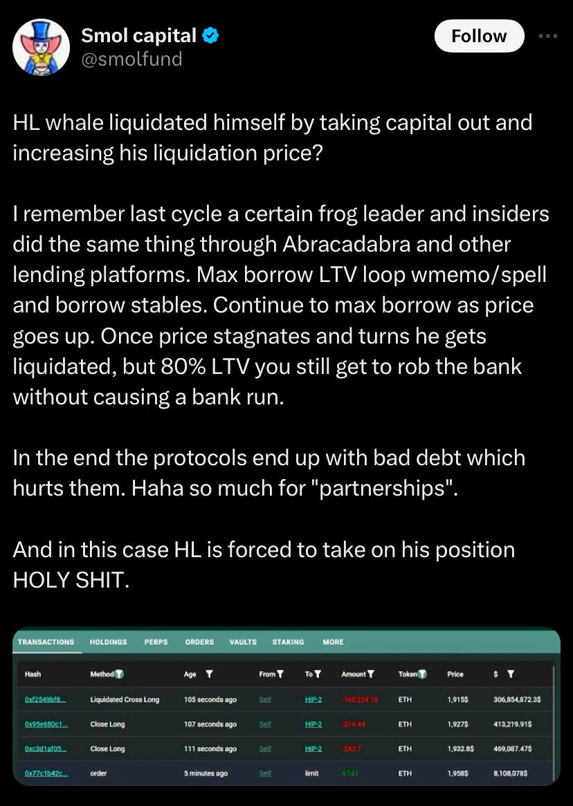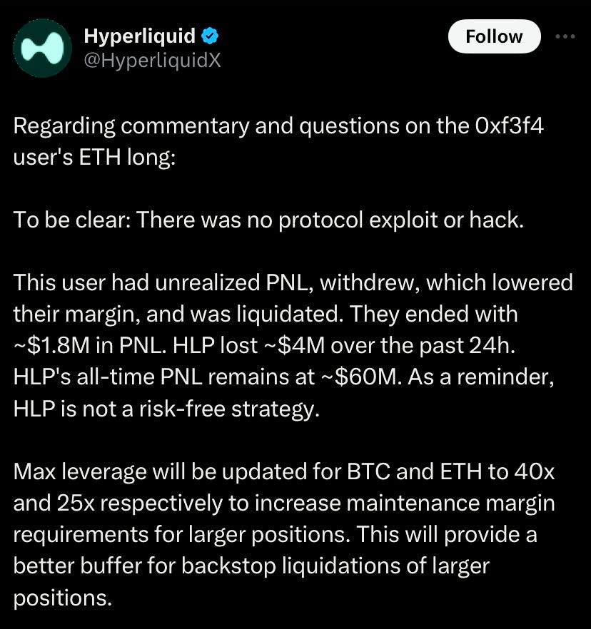 Hyperliquid whale 0xf3f4 closed his HL ETH long just before CPI and it cost Hyperliquid in bad debt ($4M) while whale made 1.8M in profit (deposited 15.2M withdrew 17M it). Hyperliquid salvages the situation by updating their BTC and ETH to 40x and 25x respectively to increase maintenance margin requirements for larger positions