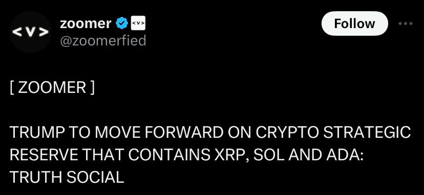 Trump to advance talks on creating XRP, ADA, SOL reserve. I expect more Altcoins to be added to US Crypto Reserve: Link tokenization role, Ondo ties to Trumpy, LTC ETF