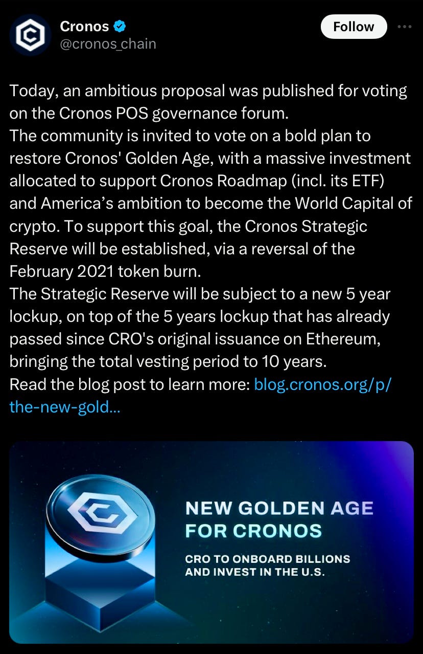 Cronos put forward a governance proposal to create a Cronos Strategic Reserve, aiming to reissue the 70 billion CRO tokens burned in February 2021