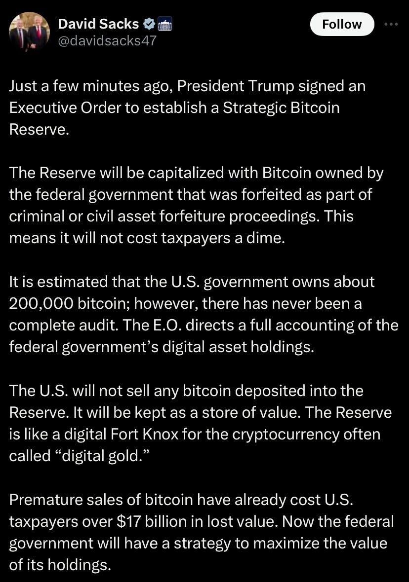 Trump signed an executive order to establish a U.S Bitcoin Reserve and prohibiting the sale of the country’s 198,109 BTC holdings. However, the market reacted weird, as the government didn’t acquire Bitcoin through purchases but rather allocations from seized Bitcoins