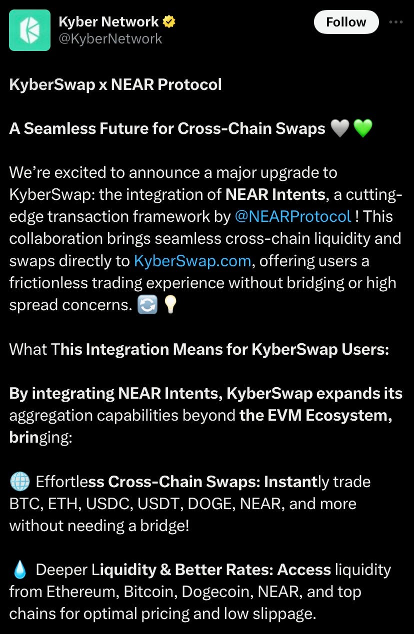 Near expands its reach to Kyberswap as they partner to provide cross chain swap without bridging thanks to Near intents