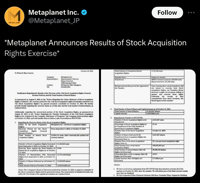 Metaplanet raised 10 billion Japanese Yen ($66.28 million) in its 11th stock sale, likely aimed at expanding its $BTC holdings.