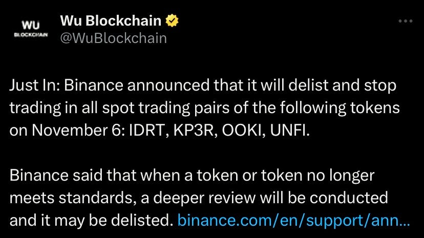 Binance to delist Rupiah Token ($IDRT), Keep3rV1 ($KP3R), Ooki Protocol ($OOKI), Unifi Protocol DAO ($UNFI) on Nov 6