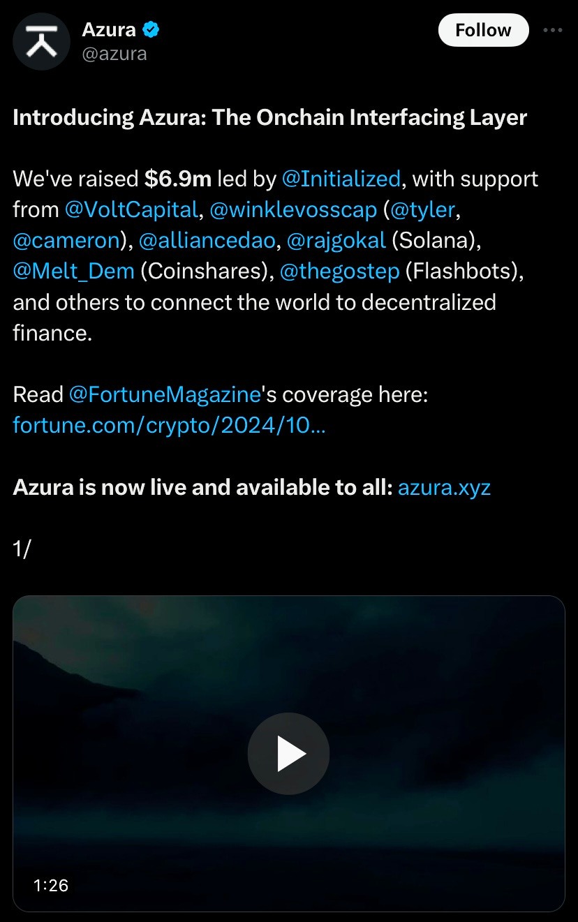 Onchain interfacing layer Azura raise $6.9M led by Initialized. They aim to aggregate all major forms of defi infra into a single app ie build a UX where every token can be traded on