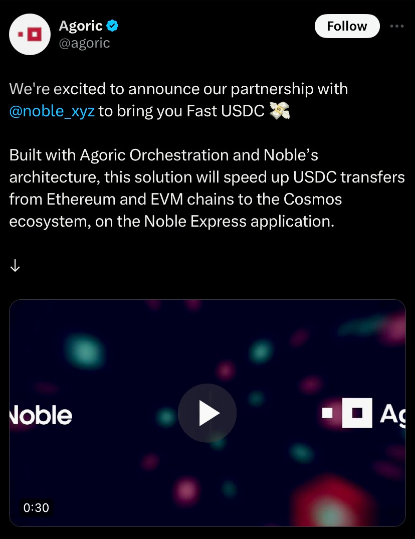 L1 designed for Multichain orchestration, Agoric partnered with modular RWA issuance chain, Noble to build fast USDC, it’ll reduce USDC transfer times from Ethereum and EVM-compatible chains to the Cosmos from up to 20 minutes to under 2 minutes.
