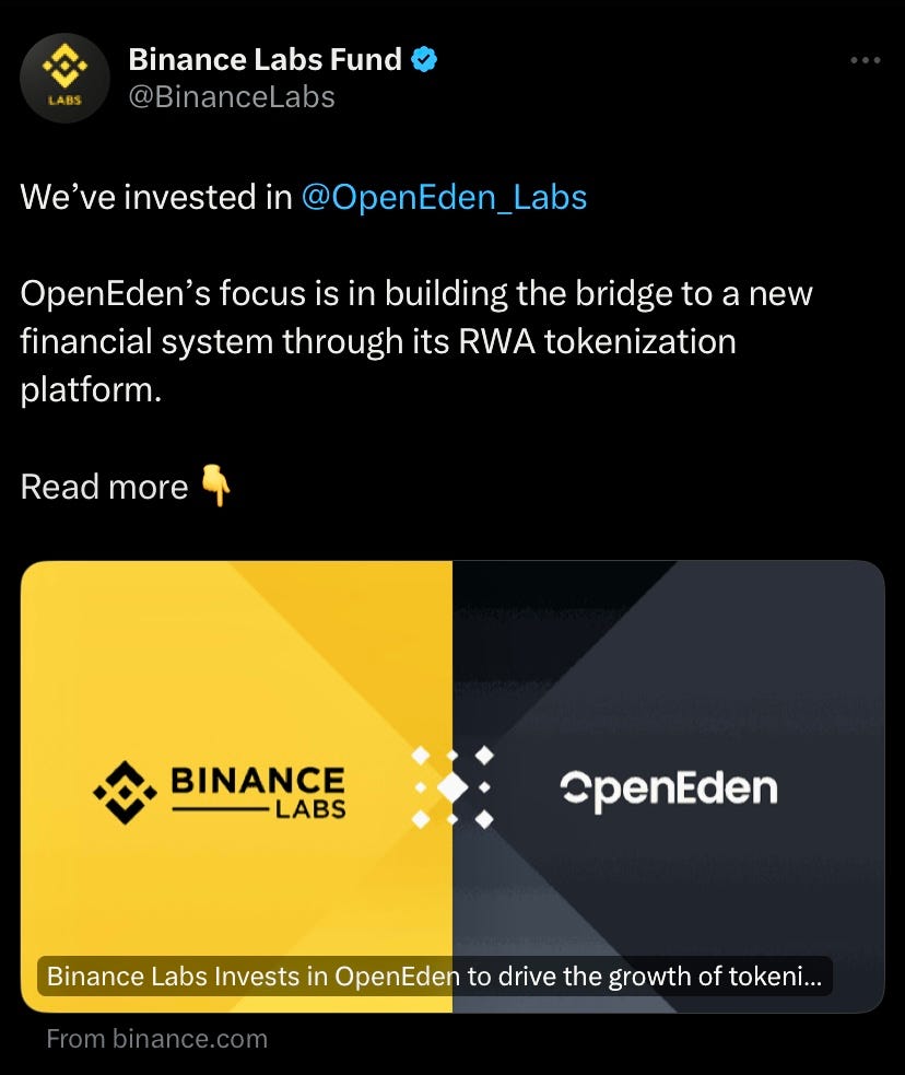Binance invests in RWA protocol— OpenEden, their tokenized U.S. T-Bill Fund is the largest outside the U.S. and the first to receive an "A" rating from Moody’s.